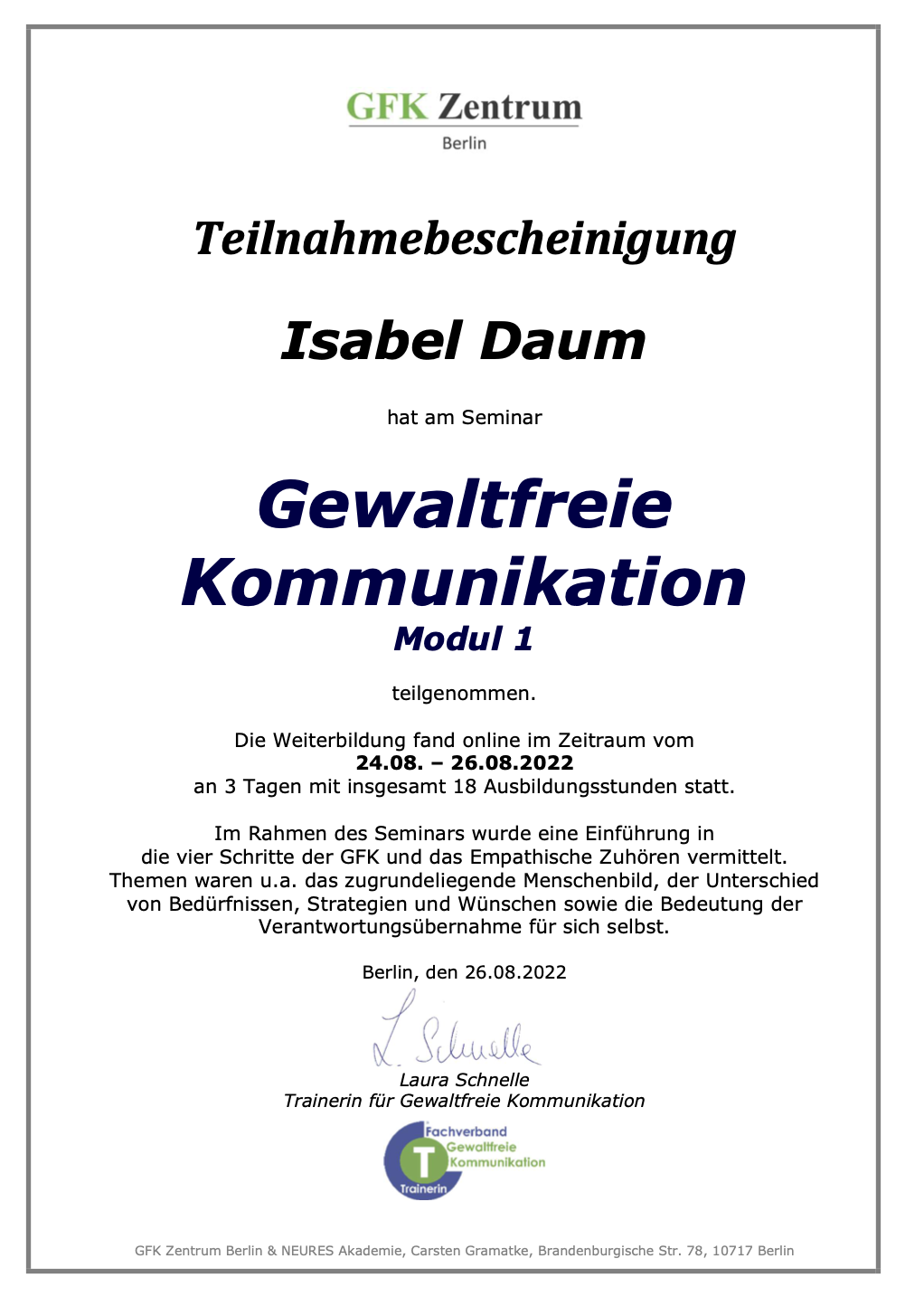 - 2022: Weiterbildung Gewaltfreie Kommunikation am GFK Zentrum Berlin