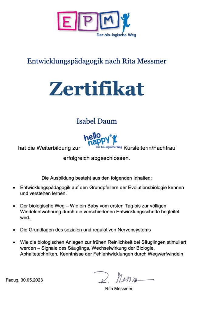 - 2022-2023: Ausbildung zur Hello Nappy Coach und Beraterin für Entwicklungspädagogik nach Rita Messmer (EPM)